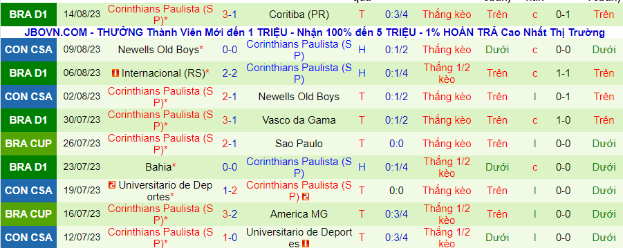 Corinthians thi đấu khá thành công trong thời gian qua khi bất bại trong 11 trận đấu liên tiếp. Trong đó, họ thắng kèo trong cả 11 trận đấu. Cùng như Sao Paulo, Corinthians cũng lọt vào tứ kết Copa Sudamericana.