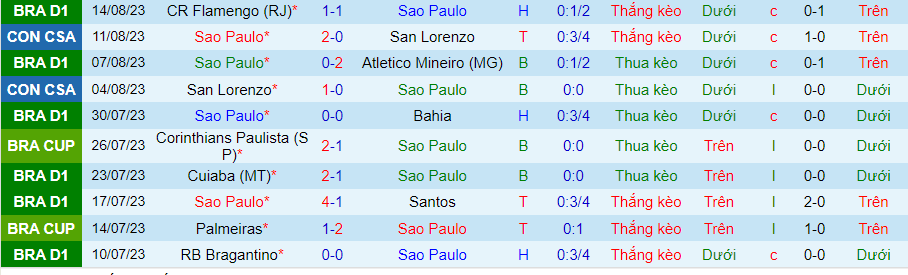 Thống kê 10 trận gần nhất của Sao Paulo