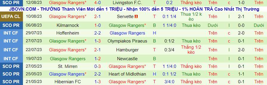 Thống kê 10 trận gần đây của Rangers