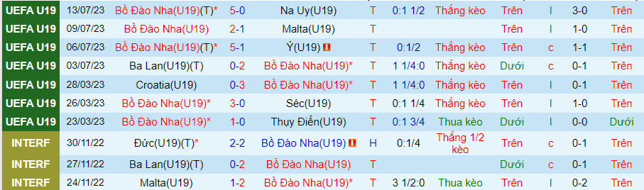 Thống kê 10 trận đấu gần nhất của U19 Bồ Đào Nha