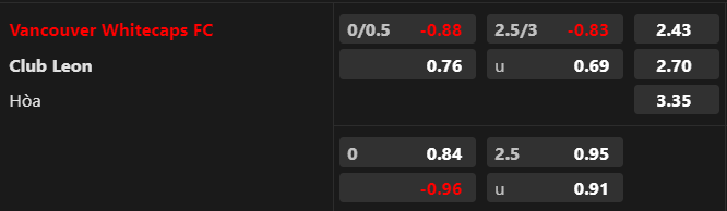 Soi kèo châu Á: Ở trận đấu này, nhà cái để Vancouver chấp -1/4 nhưng điểm ăn ở cửa Club Leon chỉ là 0.76. Rõ ràng, ở góc độ nào đó, Club Leon vẫn nhận được niềm tin. Họ vẫn có kinh nghiệm và bản lĩnh của đội bóng lớn khi tham dự đấu trường cúp. Trong khi đó, Vancouver cũng thua kèo trong 5/8 trận gần đây.