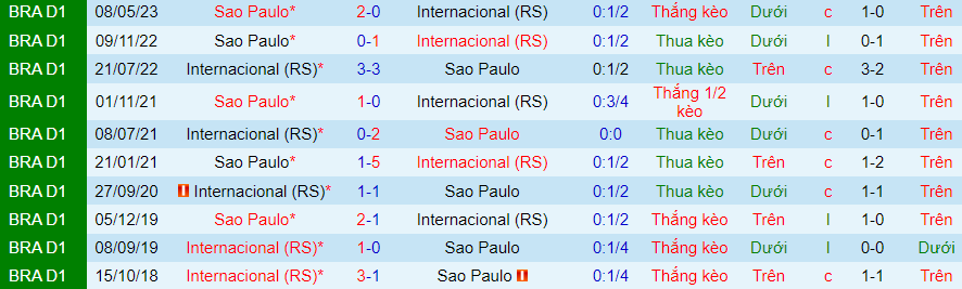 Phong độ và thống kê đối đầu của Internacional vs Sao Paulo