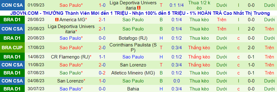 Thống kê 10 trận gần nhất của Sao Paulo