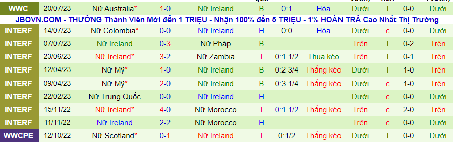 Thống kê 10 trận gần đây của nữ CH Ireland