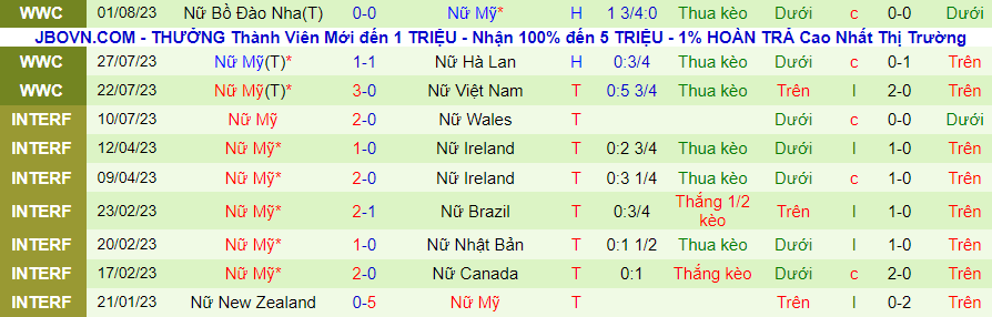 Thống kê 10 trận gần đây của nữ nữ Mỹ