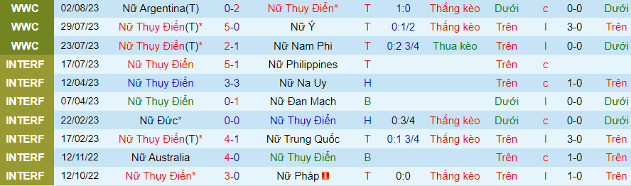Thống kê 10 trận gần đây của nữ Thụy Điển