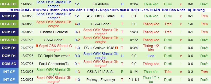 Lịch sử đối đầu giữa Aktobe vs Sepsi