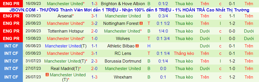 Thống kê 10 trận gần nhất của MU