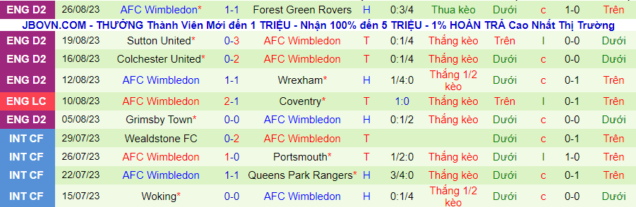 Trong 5 trận đấu này, AFC Wimbledon đã thắng kèo thẻ phạt trong 4 trận đấu. Ở vòng đấu trước ở cúp Liên đoàn Anh, đội bóng này đã giành chiến thắng trước Coventry nhưng họ cũng thắng luôn cả kèo thẻ vs tỷ số 3-1.