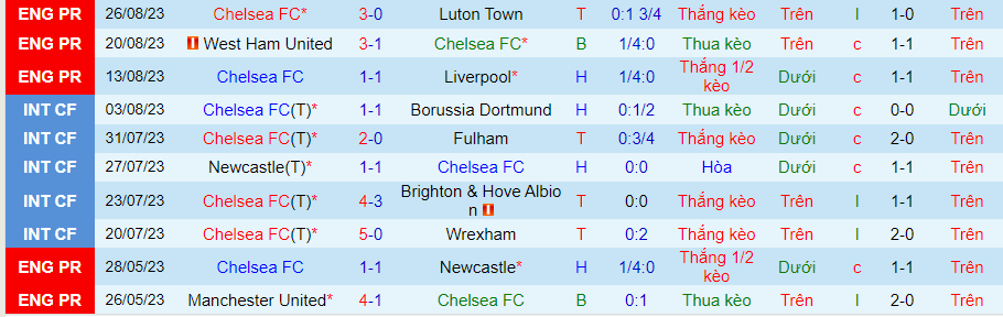 Thống kê 10 trận gần nhất của Chelsea