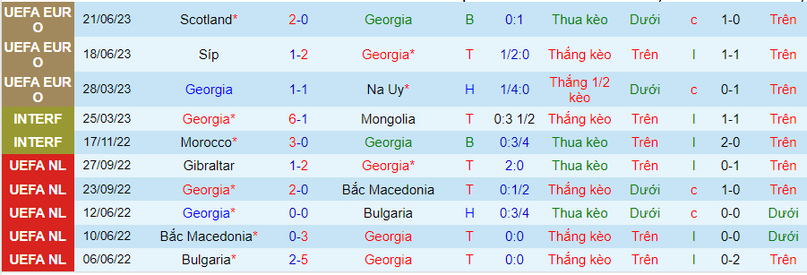 Trong khi đó, Georgia nhận 10 thẻ vàng trong 5 trận đấu gần đây. Con số ấy không phải là nhiều vs đội bóng không có tiềm lực tốt như Georgia. Dù vậy, khi đối đầu vs Tây Ban Nha, Georgia sẽ phải làm mọi cách ngăn cản. Từ đó, số lượng thẻ phạt của đội bóng này có thể nhiều hơn. Trong 2 trận đối đầu gần nhất, Georgia đều nhận nhiều thẻ hơn khi gặp Tây Ban Nha.