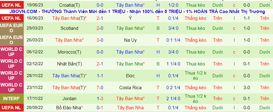 Thống kê 10 trận gần nhất của Tây Ban Nha