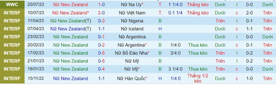 Thống kê 10 trận gần đây của nữ New Zealand