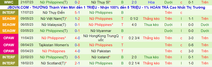 Thống kê 10 trận gần đây của nữ Philippines