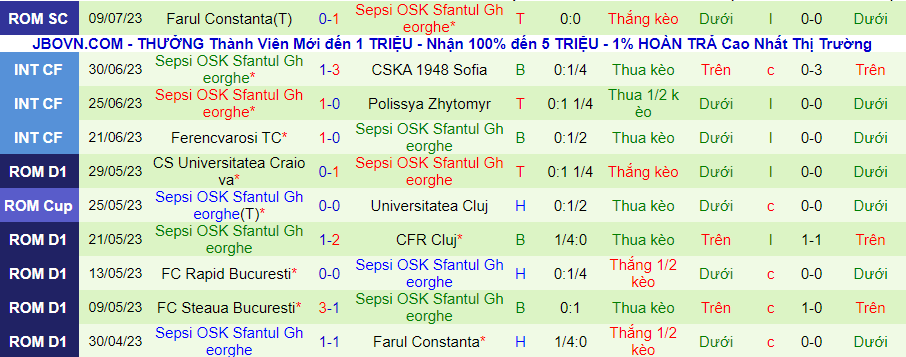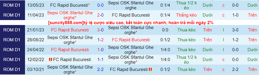 Trong trận đối đầu gần nhất ở cuối mùa giải trước, Rapid Bucuresti cũng giành chiến thắng 3-1 về số thẻ phạt so vs đối thủ. Rõ ràng, Sepsi cho thấy họ kiềm chế tốt hơn Rapid Bucuresti ở thời điểm này.