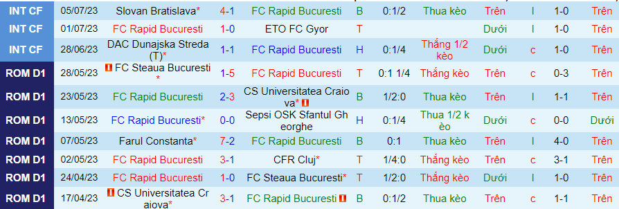 Thống kê 10 trận gần nhất của Rapid Bucuresti