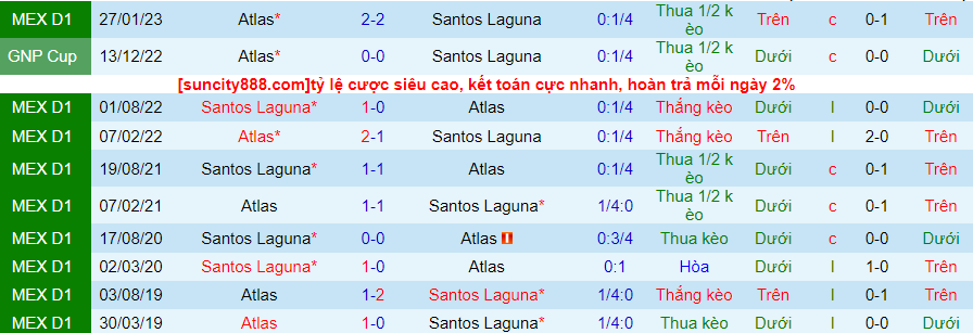 Lịch sử đối đầu giữa Santos Laguna vs Atlas