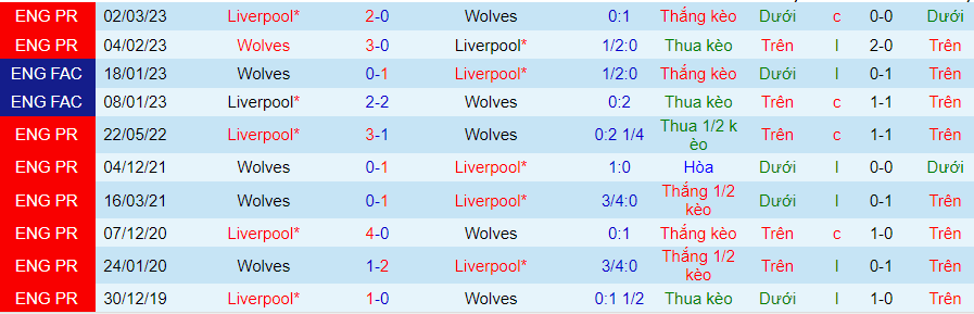 Lịch sử đối đầu giữa Wolves vs Liverpool