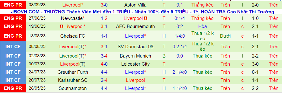 Thống kê 10 trận gần nhất của Liverpool