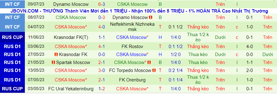 Thống kê 10 trận gần nhất của CSKA Moscow